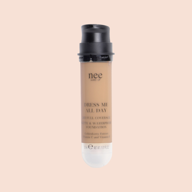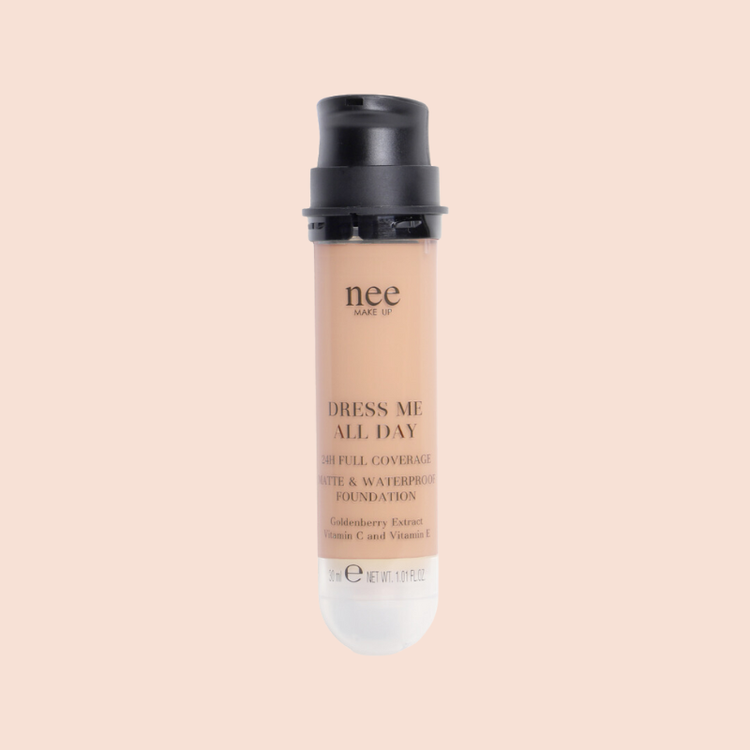 Dress Me all Day è il nuovo fondotinta ad ultra-tenuta e massimo confort per un risultato impeccabile. Nee make up Milano con la collezione fall-winter 2024 veste l’incarnato offrendo una tenuta estrema per tutto il giorno e oltre. Ad alta perfezione, uniforma qualsiasi colorito e tiene sotto controllo le zone lucide, per un effetto sofisticato, opaco e waterproof H24. Il massimo del risultato make up unito alle più efficaci virtù del trattamento. Natura e bellezza ancora una volta si alleano per donare alla pelle del viso benessere e confort. Disponibile anche in formato ricarica: Una scelta ideale per chi desidera ridurre l’impatto ambientale, contribuendo alla riduzione degli sprechi e favorendo un approccio più sostenibile.